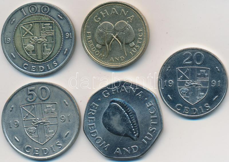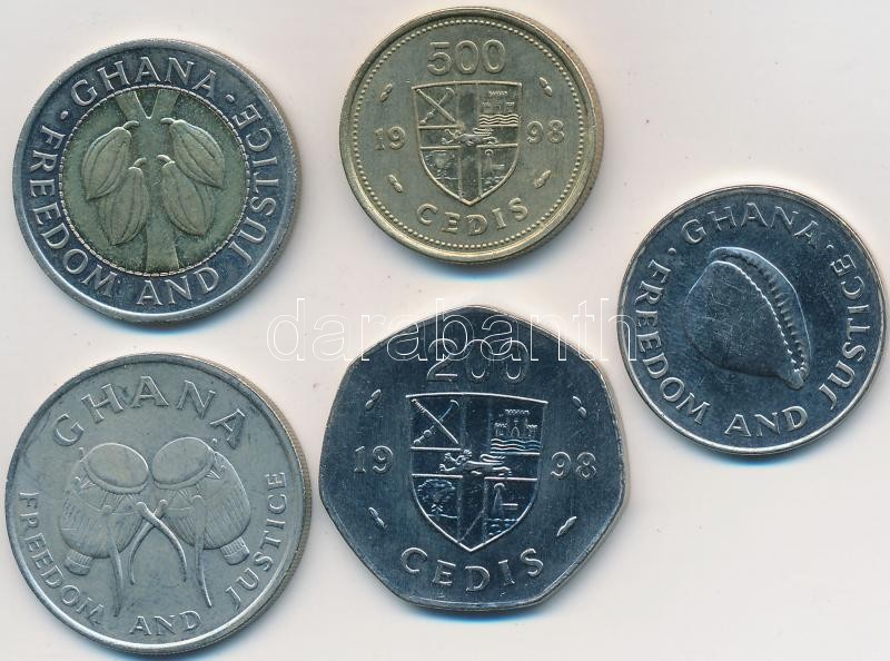 Ghána 1991-1998. 20C Ni-acél + 50C Cu-Ni + 100C Bi + 200C Ni-acél + 50... https://www.darabanth.com/de/227-Fernauktion/227.0/Numismatik/Weltweit-Munzen~600013/Ghana-1991-1998-20C-Ni-acel-plus-50C-Cu-Ni-plus-100C-Bi-plus-200C-Ni-acel-plus-500C-Ni-sargarez-T2-3Cbr3EG~II1003340