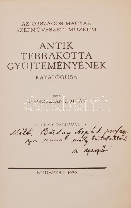 Oroszlán Zoltán: Az Országos Szépművészeti Múzeum antik terrakotta gyűjteményének katalógusa. Bp., 1930, Hornyánszky A szerző által Buday Árpád (1879-1937) régész (Buday György (1907-1990) grafikus apja) részére dedikálva. Papírkötésben, jó állapotban.
