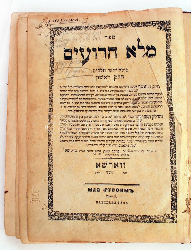 Jolles, Jacob Zevi ben Naftali: Sefer melo ha-Ro'im. Varsó, 1898. A neves galíciai Talmud-tudós és kabbalista rabbinikus jogról írt enciklopédikus műve. Kopott félbőr kötésben, gerince hiányzik, az elején több lapon szúrágásokkal