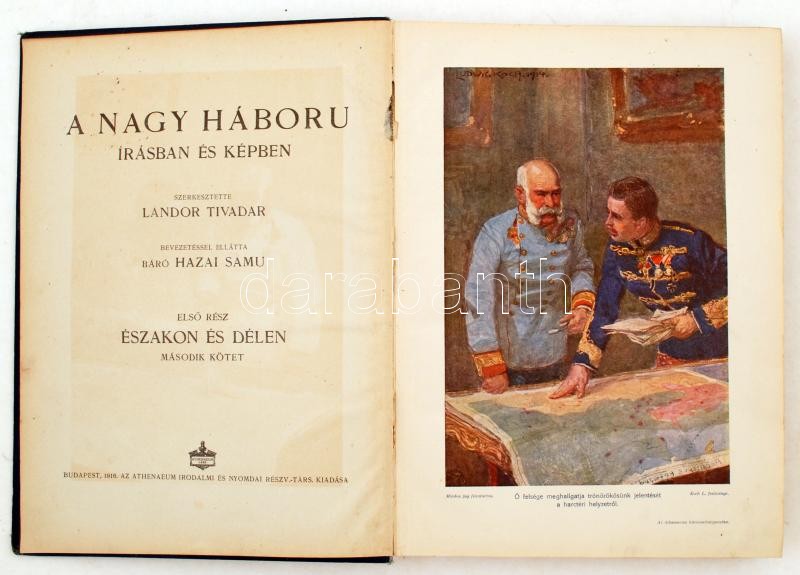 A Nagy Háború írásban és képben. Szerk.: Landor Tivadar. 1. rész: Északon és délen. 2. köt. Bp., 1916, Athenaeum. Kopott, aranyozott, gazdagon díszített vászonkötésben, gerince kis szakadásokkal, egyébként jó állapotban.