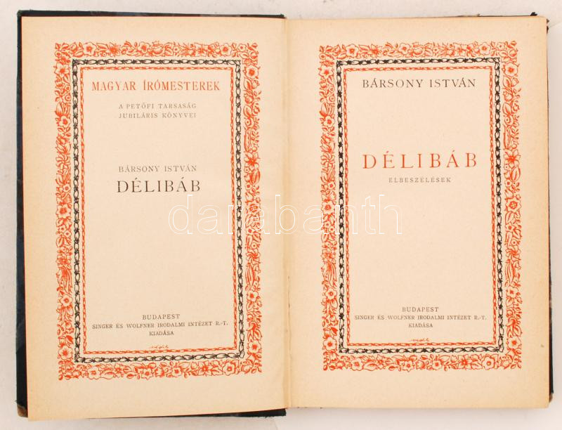 Bársony István: Délibáb. Elbeszélések. Bp., 1927, Singer és Wolfner (Magyar írómesterek). Aranyozott gerincű, kicsit kopott félbőr kötésben, egyébként jó állapotban.
