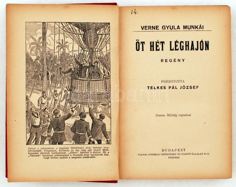 Verne Gyula: Öt hét léghajón. Bp., é.n. Tolnai. Nemes Mihály rajzaival... https://www.darabanth.com/de/228-Fernauktion/228.0/Andere-Sammelgebiete/Bucher-Sonstige-Raritaten~29/Verne-Gyula-Ot-het-leghajon-Bp-en-Tolnai-Nemes-Mihaly-rajzaival-Festett-egeszvaszon-~II1020147