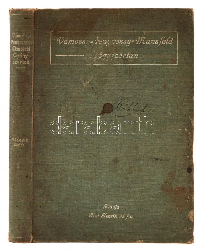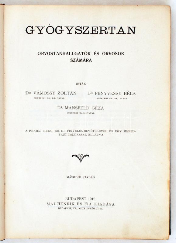 Vámossy Zoltán dr., Fenyvessy Béla dr., Mansfeld Géza dr.: Gyógyszertan Orvostanhallgatók és orvosok számára. Budapest, 1912, Mai Henrik és Fia. Kissé viseltes kiadói egészvászon kötésben.