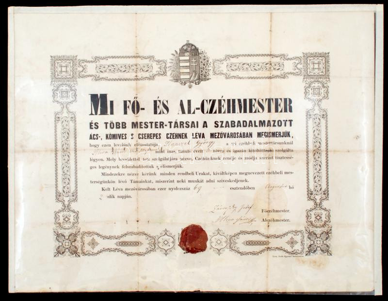 1869 Léva, Ács-, kőműves és cserepes céh által kiadott díszes mesterle... https://www.darabanth.com/de/228-Fernauktion/228.0/Andere-Sammelgebiete/Dokument~35/1869-Leva-Acs--komuves-es-cserepes-ceh-altal-kiadott-diszes-mesterlevel-viaszpecsettel~II1019267
