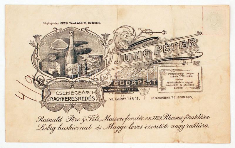 Beschreibung: 1903 Bp. IV. Vámház körút 12., Jung Péter Csemegeáru Nagykereskedésének díszes fejléces számlája