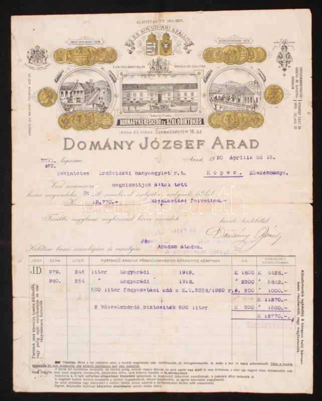 Beschreibung: 1920 Arad, Domány József bornagykereskedő és szőlőbirtokos által kiállított díszes fejléces számla