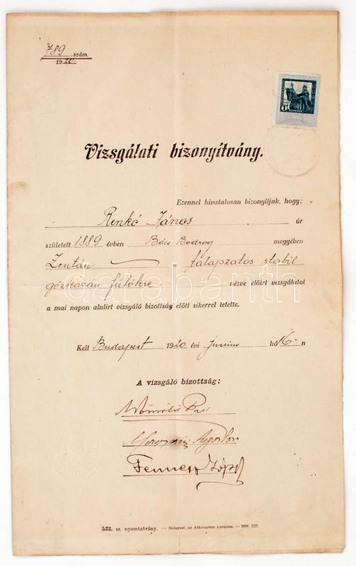 1920 Bp., A Gőzgépkezelők M. Kir. Vizsgálóbizottsága által kiállított ... https://www.darabanth.com/de/228-Fernauktion/228.0/Andere-Sammelgebiete/Dokument~35/1920-Bp-A-Gozgepkezelok-M-Kir-Vizsgalobizottsaga-altal-kiallitott-vizsgalati-bizonyit~II1020640