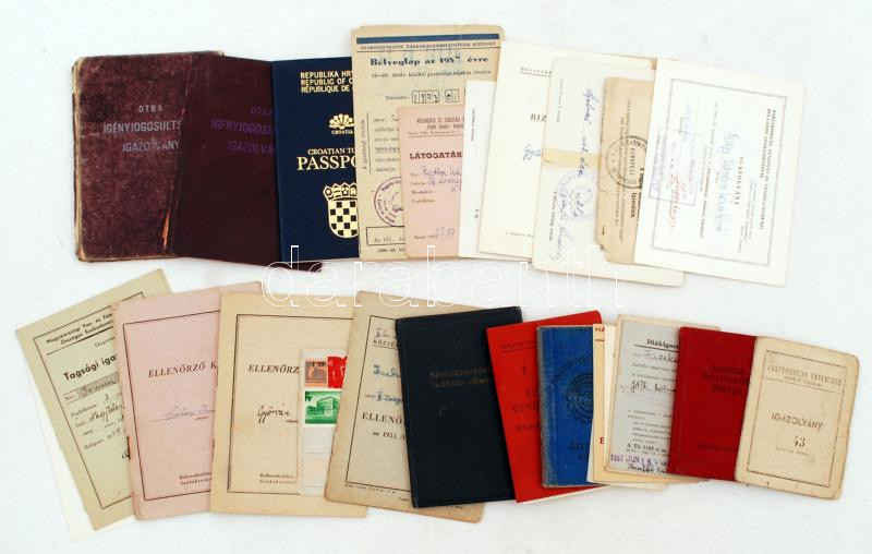 Beschreibung: cca 1950-1970 Vegyes okmány tétel: látogatási jegyek, igazolványok, tagsági könyvek, útlevél, stb., összesen 28 db