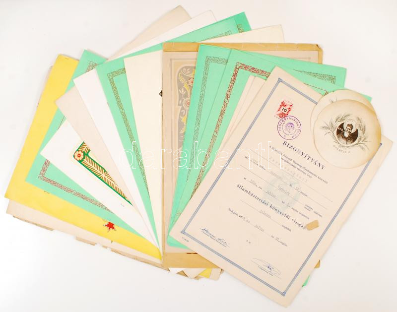 Beschreibung: cca 1954-1991 Vegyes oklevél tétel(államháztartási könyvelői, vagyonjegy, Budapesti V. kerületi Tanács Végrehajtó Bizottsága stb.)