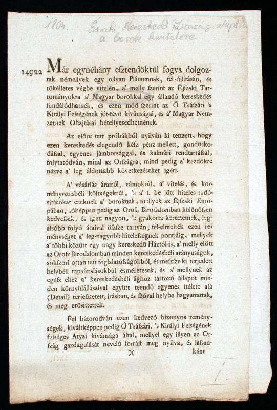 1804 Bécs, Az Északi Kereskedő Társaság megalapításának tervezete boro... https://www.darabanth.com/de/228-Fernauktion/228.0/Andere-Sammelgebiete/Drucksachen~5/1804-Becs-Az-Eszaki-Kereskedo-Tarsasag-megalapitasanak-tervezete-borok-kivitelere~II1011213