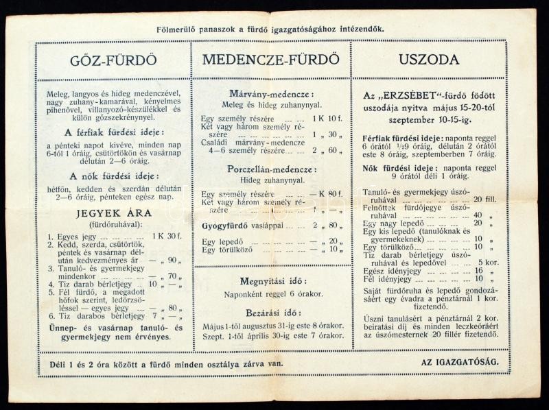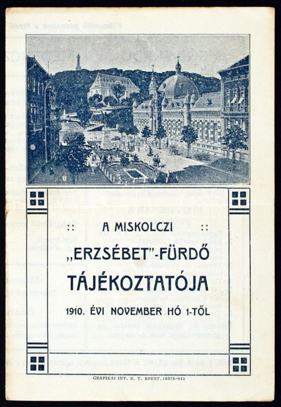 Beschreibung: 1910 A Miskolczi "Erzsébet" -Fürdő Tájékoztatója 1910. évi november hó 1-től, 150x100