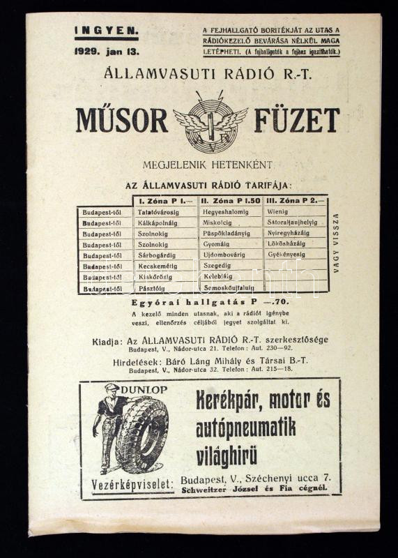 1929 A újonnan megalakult Államvasúti Rádió R.T.(a magyar gyorsvonatokon 1929-ben került bevezetésre) ingyenes műsorfüzete, belsejében hirdetésekkel, 32p
