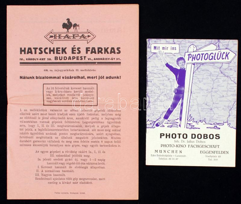 1930-1956 HAFA (Hatschek és Farkas) és Photo Dobos fényképészeti árjeg... https://www.darabanth.com/de/228-Fernauktion/228.0/Andere-Sammelgebiete/Drucksachen~5/1930-1956-HAFA-Hatschek-es-Farkas-es-Photo-Dobos-fenykepeszeti-arjegyzekei-egyik-abrakka~II1019035
