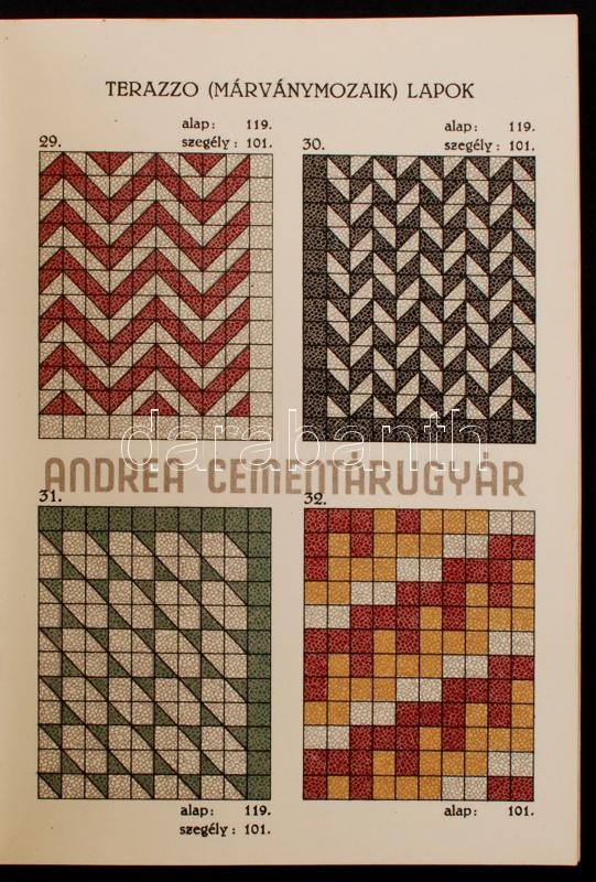 1937 Az Andrea Cementárugyár színes, dekoratív mozaiklap katalógusa az... https://www.darabanth.com/de/228-Fernauktion/228.0/Andere-Sammelgebiete/Drucksachen~5/1937-Az-Andrea-Cementarugyar-szines-dekorativ-mozaiklap-katalogusa-az-1937-tol-ervenyes-ar~II1017852