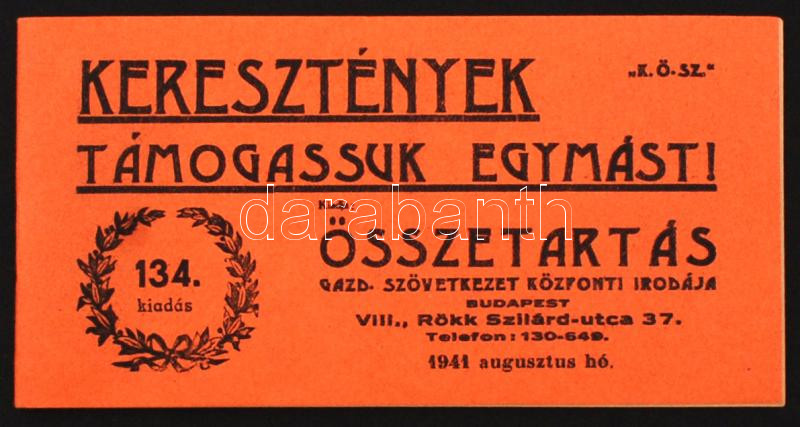 1941 A KÖSZ (Keresztény Összetartás Gazdasági Szövetkezet) propaganda füzete a keresztény gazdasági együttműködés szorgalmazására a résztvevő cégek felsorolásával, 36p