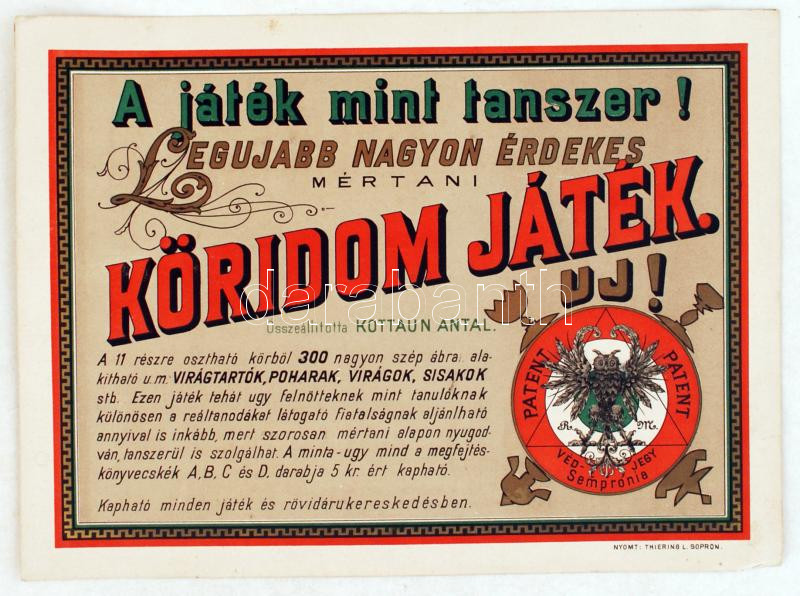 cca 1890 Sopron, Kottaun Antal köridom játék nagyméretű litho reklámny... https://www.darabanth.com/de/228-Fernauktion/228.0/Andere-Sammelgebiete/Drucksachen~5/cca-1890-Sopron-Kottaun-Antal-koridom-jatek-nagymeretu-litho-reklamnyomtatvany-26x20-cm~II1016571