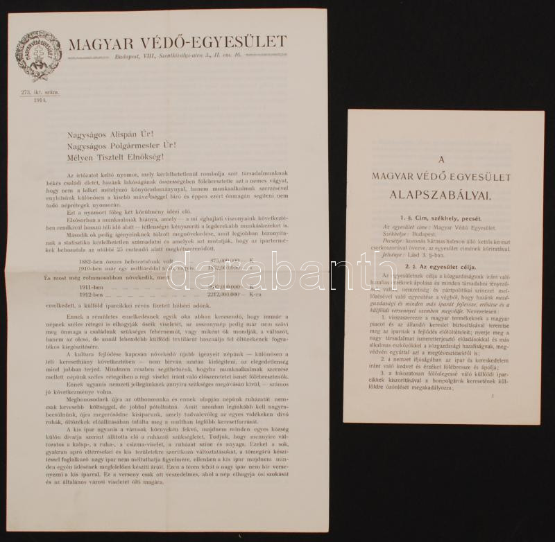 Beschreibung: cca 1912 Magyar Védő Egyesület nyomtatványai: Alapszabályai és 4 oldalas felterjesztése 340x210mm