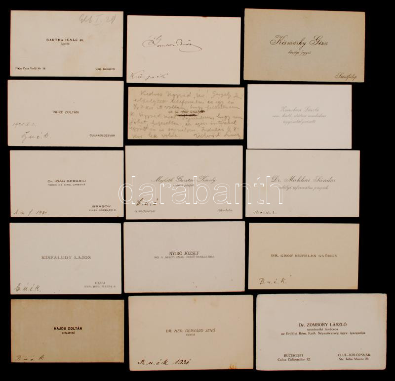 cca 1927-1931 Erdélyi, döntően kolozsvári névjegykártya-gyűjtemény neves személyiségektől(Majláth Gusztáv Károly erdélyi püspök, Nyírő József író, Dr. Makkai Sándor erdélyi református püspök, Dr. Gróf Bethlen György stb.), többön kézzel írt üzenetekkel neves személyiségektől