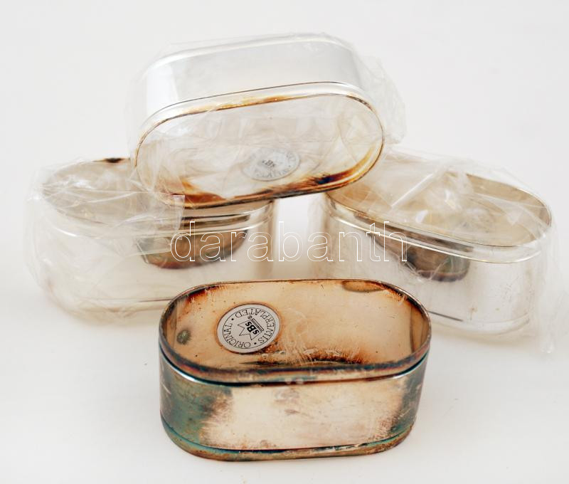 Beschreibung: 4 darabos ezüstözött fém szalvétagyűrű-csomag, saját dobozában, az egyik kopásnyomokkal