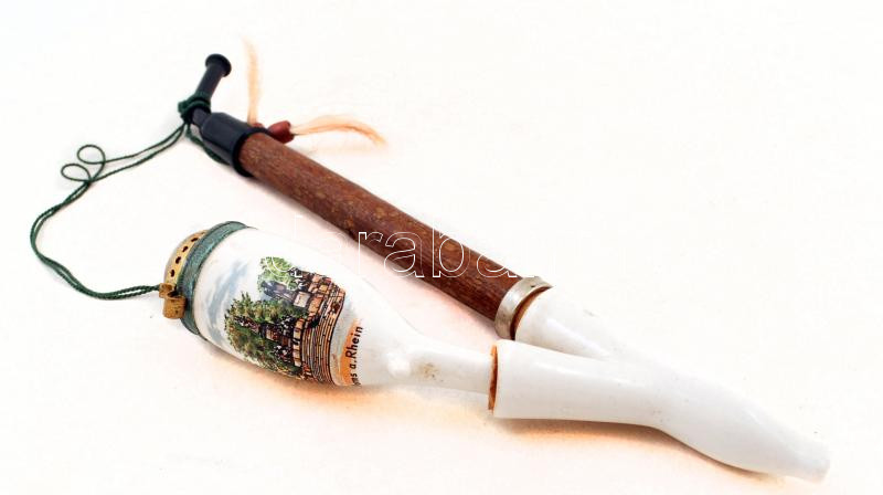 Beschreibung: Fém fedelű porcelán pipa, "Worms am Rhein" felirattal, matricás, fából készült szárral, h: 27 cm