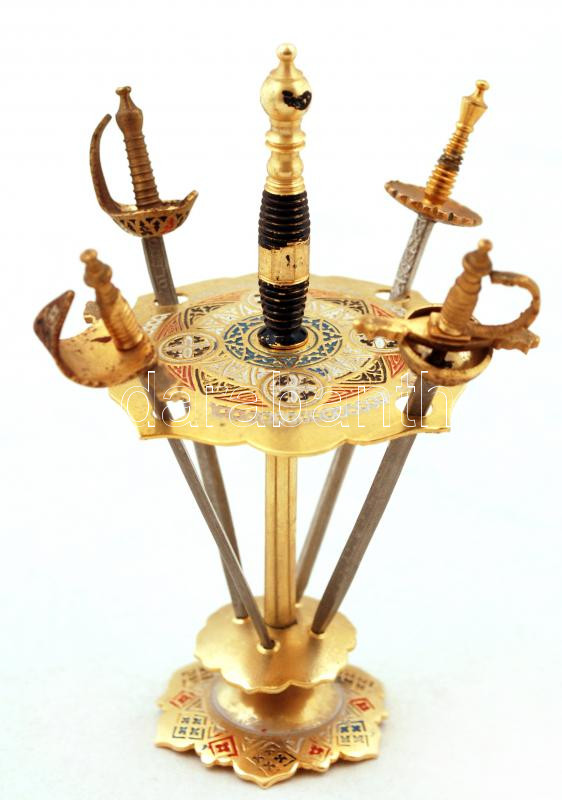 Beschreibung: Gazdagon díszített spanyol gyártmányú 4 darabos réz szendvicstűző szett, tartóval