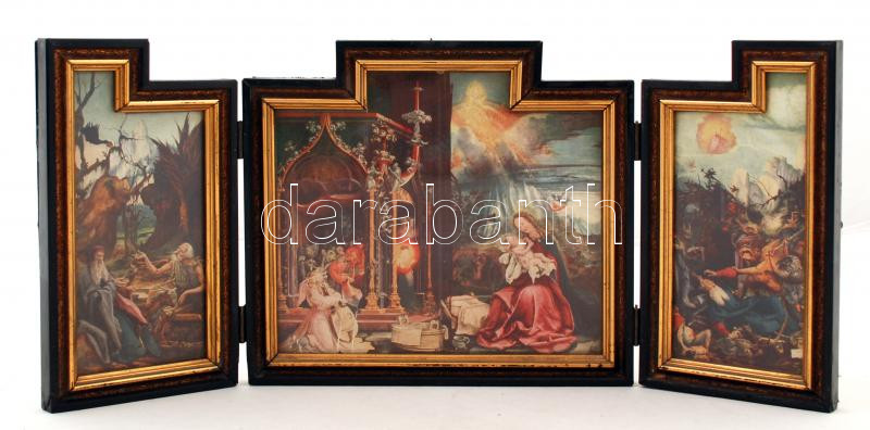 Beschreibung: Kihajtható fa triptichon, benne nyomattal, aranyozott díszítéssel, kopásnyomokkal, kihajtva: 23×52,5 cm, összecsukva: 23×26