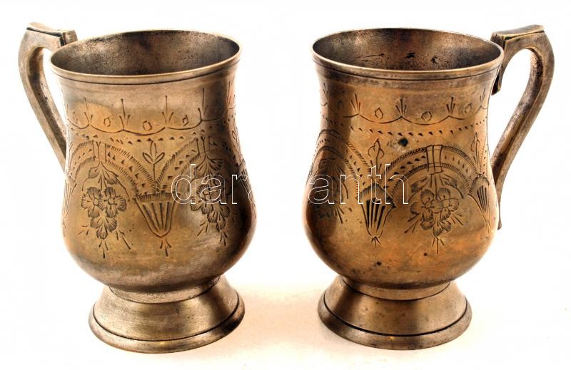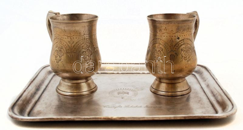 Beschreibung: Régi fém tálca Szent Koronával, "Royal Nagy Szálloda" és "VendéglÅ‘s Szakiskola Budapest" felirattal, jelzett, 32×26 cm + 2 db fém füles korsó virágmotÃvumos dÃszÃtéssel, jelzett, d: 8 cm, m: 12,5 cm