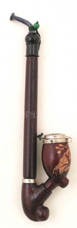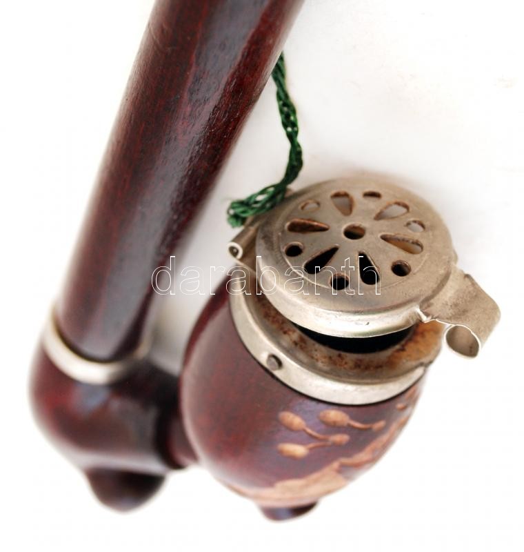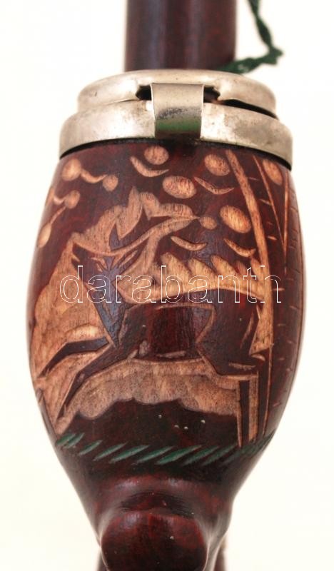 Beschreibung: Vadász motívummal díszített, faragott Arkus márkájú fa pipa, fém fedéllel, szárral, h: 27,5 cm