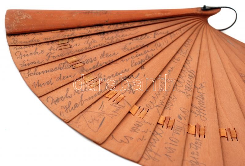 cca 1910 Antik fából készült legyező, lapjain érdekes régi emlékfelje... https://www.darabanth.com/de/228-Fernauktion/228.0/Andere-Sammelgebiete/Flohmarkt~31/cca-1910-Antik-fabol-keszult-legyezo-lapjain-erdekes-regi-emlekfeljegyzesekkel-h-15-5-c~II1017475
