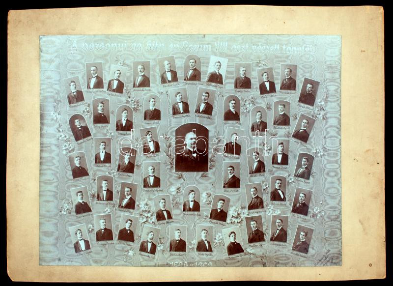 Beschreibung: 1909 A pozsonyi evangélikus líceum végzett tanulói, kistabló Mindszenty Béla műterméből, 51 nevesített portréval, 29x38 cm, karton 37x48 cm