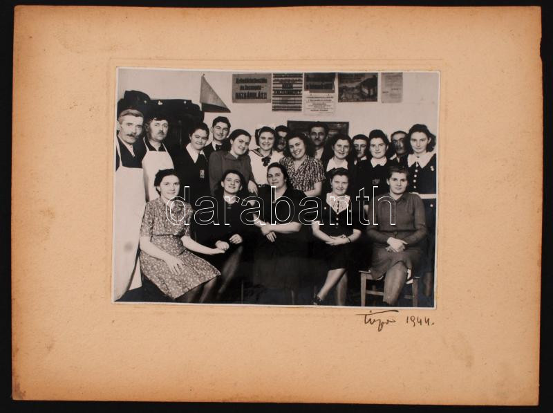 Beschreibung: 1944 Gazdasszonyképző tanfolyam hallgatói Csugaron, a falon levő plakátok kordokumentumok, 17x23 cm, karton 29,5x38,5 cm
