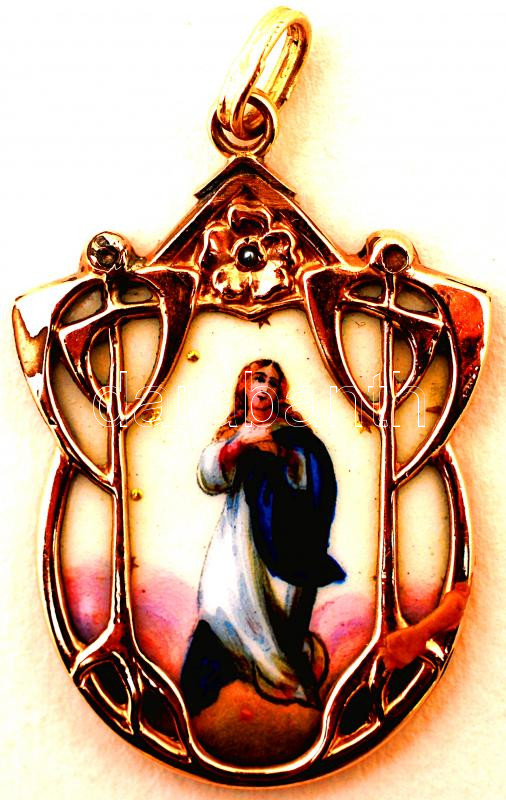 Beschreibung: Arany (Au) 18 K keretű szecessziós porcelán medál, br: 9,4 g