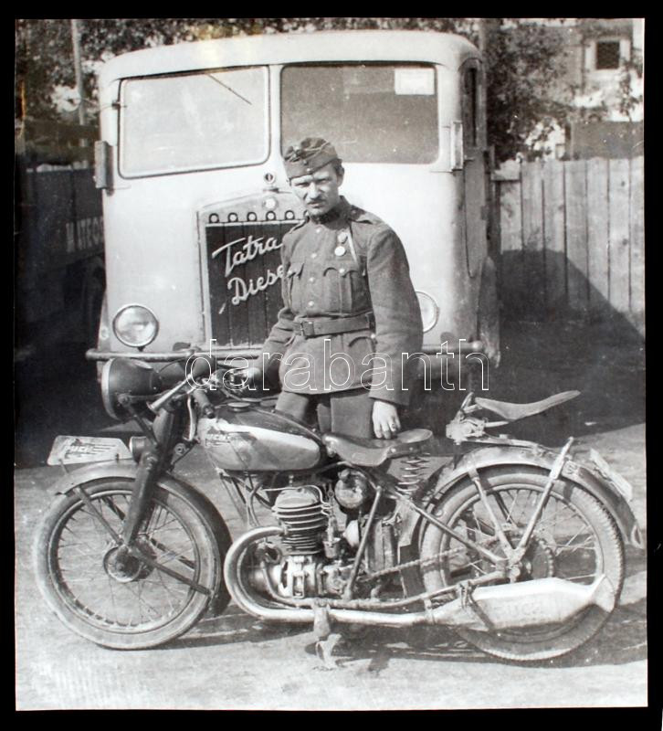 cca 1947 Bodnár István (Fehérgyarmat): Katona Puch motorkerékpárral és egy Tátra teherautóval, a szerző hagyatékában levő, korabeli negatívról készült későbbi nagyítás, 20x18 cm