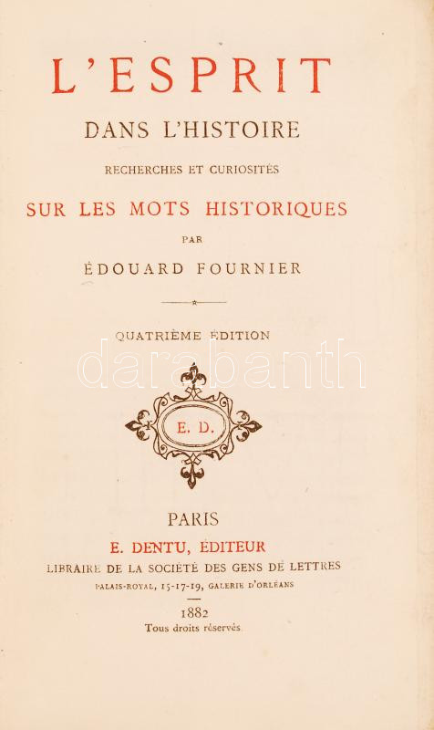 Fournier, Édouard: L'espirt dans l'histoire. Recherches et curiosités sur les mots historiques. Párizs, 1882, E. Dentu. Aranyozott, bordázott gerincű bőrkötésben, a felső lapszélek aranyozottak, jó állapotban.