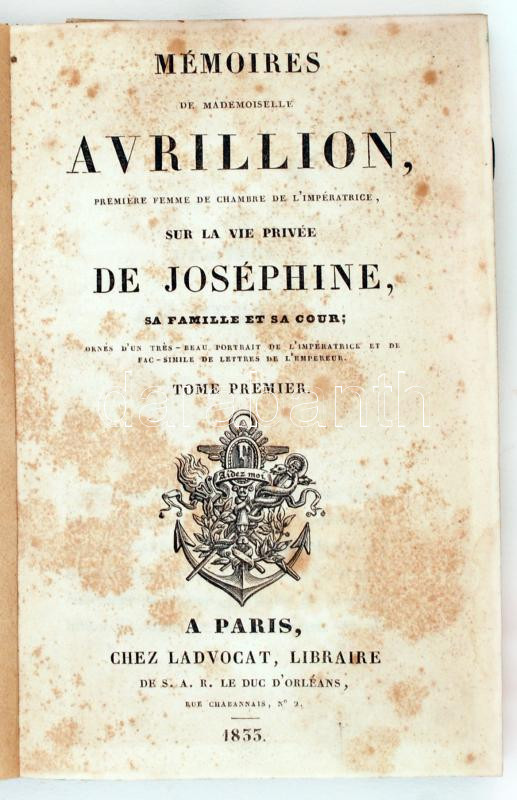 Mémoires de mademoiselle Avrillion, Première Femme De Chambre De L'impératrice, Sur La Vie Privée De Josephine, Sa Famille Et Sa Cour, tome premier. A Paris, Chze Ladvocat, Libraire de S.A.R. le Duc D'orléans, 1833. Félvászon kötés, színezett lapszélek, kihajtható melléklettel, lapok foltosak, kissé kopottas állapotban / half linen binding with small faults