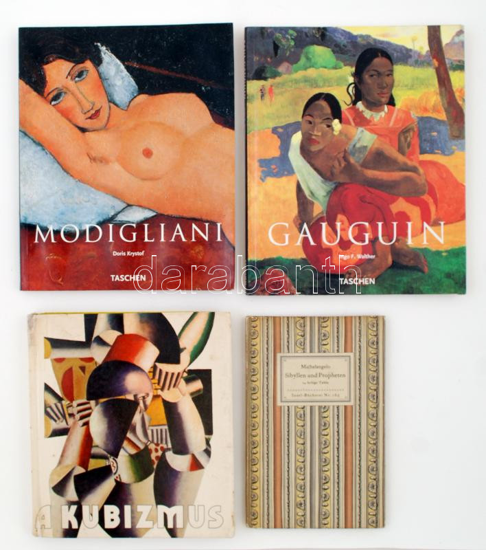 Beschreibung: Vegyes művészettörténeti könyvtétel magyar és német nyelven: Golding: A kubizmus, Walther:Gauguin, Krystof: Modigliani, Michelangelo: Sibyllen und Propheten