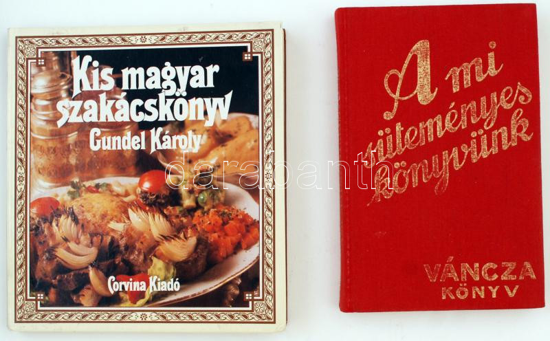 2 db szakácskönyv-A mi süteményes könyvünk. Gyakorlati útmutatások a torták, mignonok és mindenféle sütemények helyes elkészítésére és díszítésére. Közel félezer képpel és kipróbált eredeti süteményreceptekkel; Bp., 1936, Váncza, Reprint!; Gundel Károly: Kis magyar szakácskönyv. Átdolgozták fiai: Gundel Ferenc és Gundel Imre. Bp., Corvina, Reprint! Kiadói egészvászon és kartonált kötés, mindkettő jó állapotban.