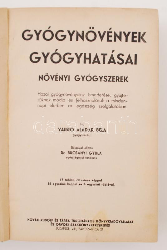 Varró Aladár Béla: Gyógynövények gyógyhatásai. Hazai gyógynövényeink ismertetése, gyűjtésének módja és felhasználásuk a mindennapi életben az egészség szolgálatában. 17 táblán 70 színes képpel 95 egyszínű képpel és 6 egyszínű táblával. Kopottas kiadói félvászon kötésben.