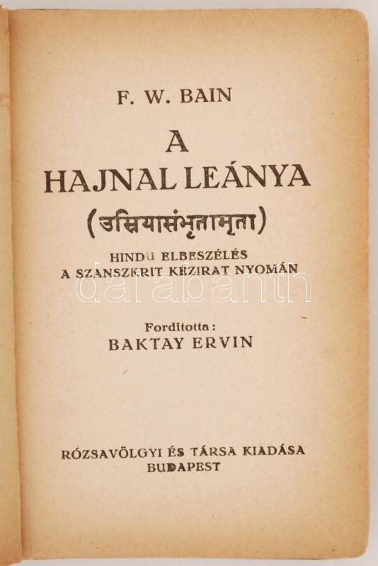 Bain F(rancis) W(illiam): A hajnal leánya. Hindu elbeszélés a szanszkrit kézirat nyomán. Ford. Baktay Ervin. Budapest, 1920, Rózsavölgyi és Társa Kiadása. Kopottas kiadói karton kötésben.