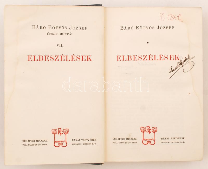 Báró Eötvös József: Elbeszélések. Budapest, 1902, Révai. Szecessziós, ... https://www.darabanth.com/de/229-Fernauktion/229.0/Andere-Sammelgebiete/Bucher-Sonstige-Raritaten~41/Baro-Eotvos-Jozsef-Elbeszelesek-Budapest-1902-Revai-Szecesszios-kiadoi-egeszvaszon~II1021374