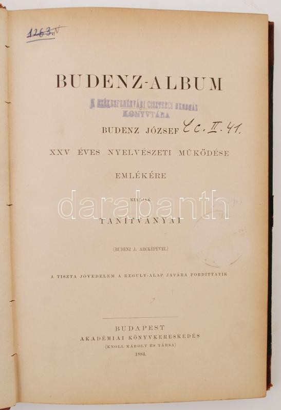 Budenz- album. Budenz József XXV éves nyelvészeti működése emlékére kiadják tanítványai (Budenz J. arcképével). Budapest, 1884, Akadémiai Könyvkereskedés (Knoll Károly és Társa). Kissé kopottas félbőr kötésben.