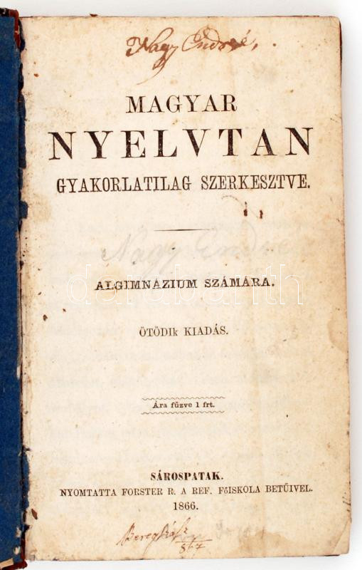 Beschreibung: Magyar nyelvtan gyakorlatilag szerkesztve. Algimnázium számára. Sárospatak, 1866, Nyomtatta Forster R. a Ref. Főiskola betűivel. Félbőr kötésben.