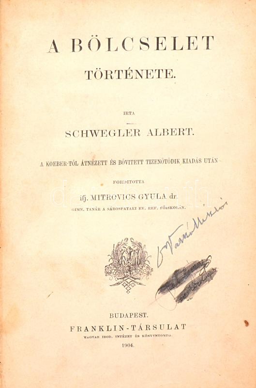 Schwegler Albert: A bölcselet története. A Koeber-től átnézett és bővített tizenötödik kiadás után. Fordította ifj. Mitrovics Gyula dr. Budapest, 1904, Franklin. Félvászon kötésben, festett lapszél.