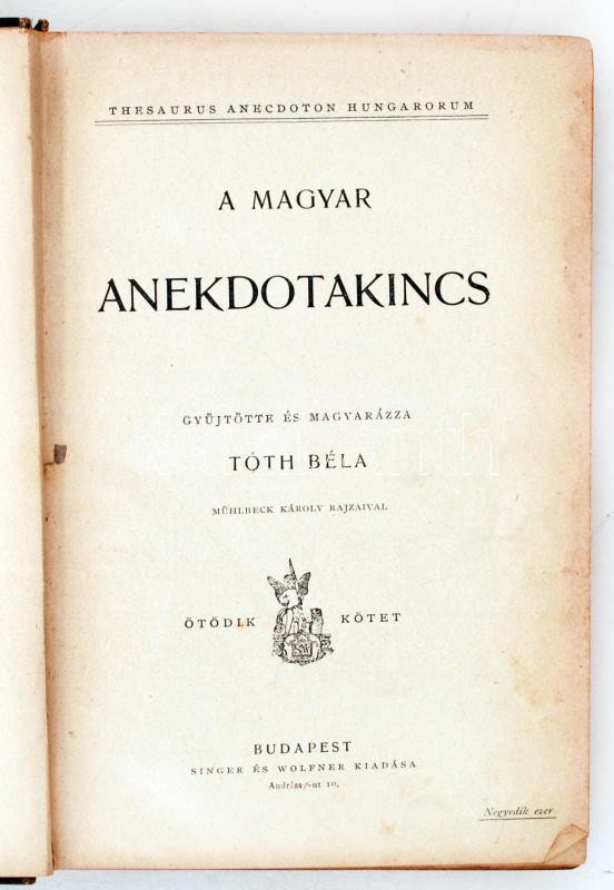 Tóth Béla: A magyar anekdota kincs. Gyűjtötte és magyarázza -- Mühlbeck Károly rajzaival. Ötödik kötet. Budapest, é.n., Singer és Wolfner Kiadása. Viseletes egészvászon kötésben.