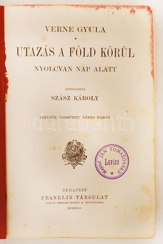 Verne Gyula: Utazás a Föld körül nyolczvan nap alatt. Egyedül jogosított képes kiadás. Bp., é.n., Franklin-Társulat. Első kiadás! Illusztrált, kiadói aranyozott, festett egészvászon kötés, kissé kopottas, egyébként jó állapotban.