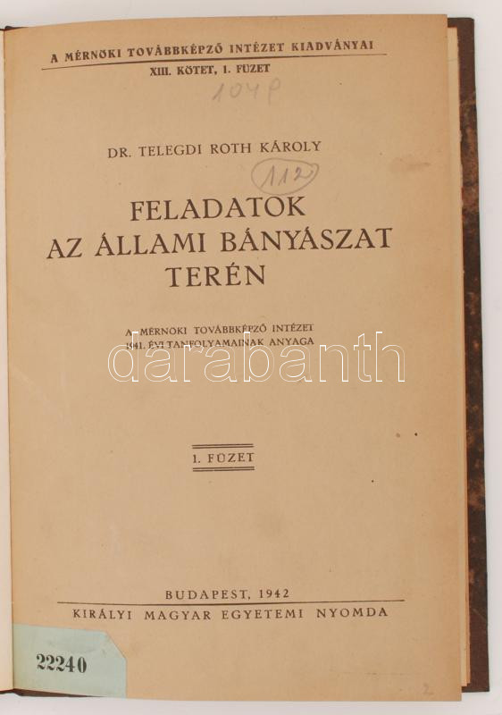 Beschreibung: Telegdi Tóth Károly: Feladatok az állami bányászat terén. Bp., 1942. K. M. egyetemi nyomda. 8p. Korabeli félvászon kötésben