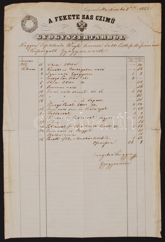 Beschreibung: 1852 Szekszárd, A Fekete Sas című Gyógyszertár által a faddi lelkész számára kiállított számla 6k szignettás papíron