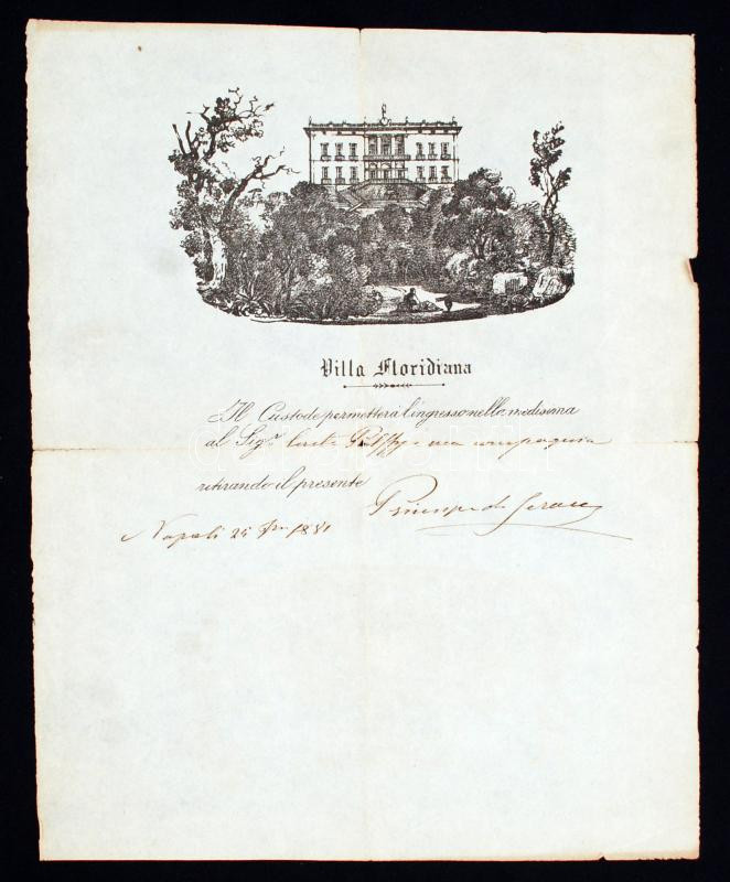 1881 A nápolyi Villa Floridiana díszes levélpapírja, rajta a belépésre... https://www.darabanth.com/de/229-Fernauktion/229.0/Andere-Sammelgebiete/Dokument~400432/1881-A-napolyi-Villa-Floridiana-diszes-levelpapirja-rajta-a-belepesre-jogosito-engedellyel~II1023998