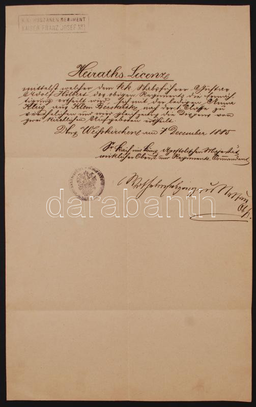 1885 Weißkirchen, Német nyelvű házassági engedély a K.K. Huszaren Regiment Kaiser Franz Josef No.1. pecsétjével /