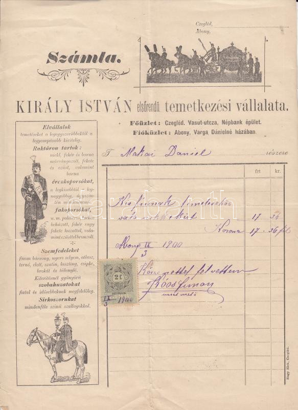 Beschreibung: 1900 Abony, Király István elsőrendű temetkezési vállalatának díszes fejléces számlája 2f okmánybélyeggel